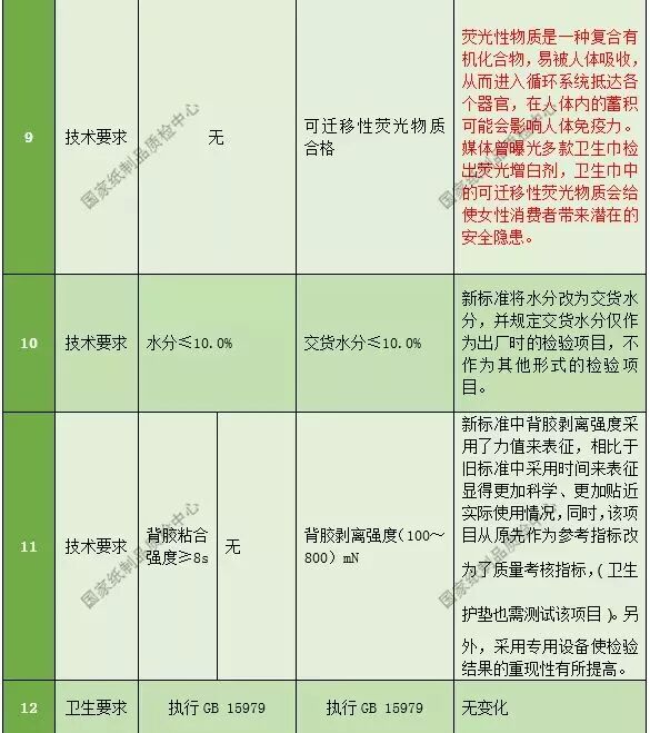 新修訂的衛生巾標準新增了消費者較為關心的甲醛含量和可遷移性熒光物質等**性能指標,并對部分使用性能指標進行了修改,如滲入量改為吸收速度、背膠粘合強度改為背膠剝離強度等,最后對生產衛生巾的原料也做了相關的規定。